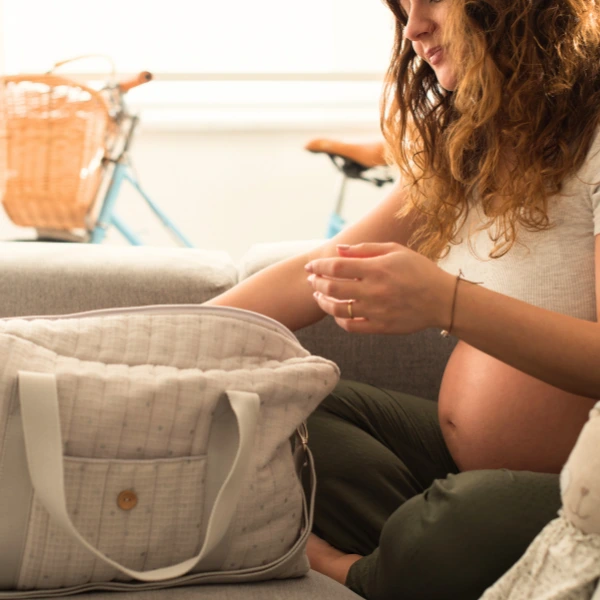 Ce sac contient uniquement ce dont vous aurez besoin pendant le travail et dans les toutes premières heures après la naissance (documents, tenue pour bébé, bouteille d’eau…).