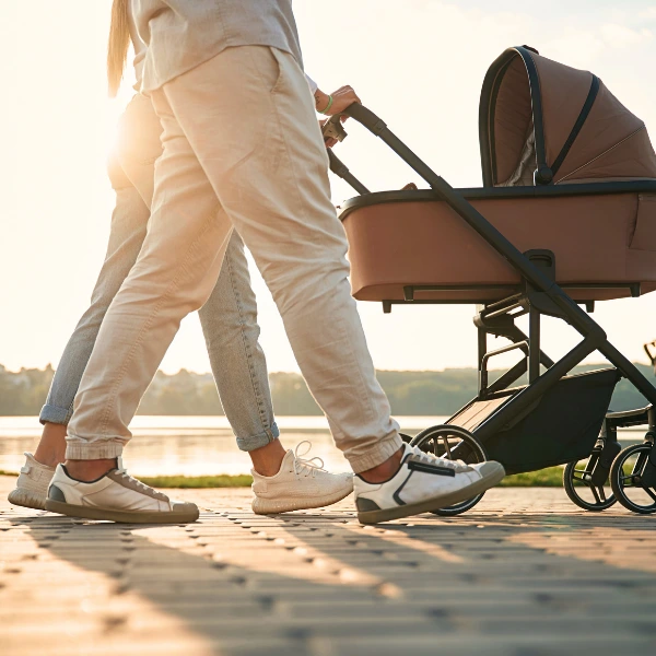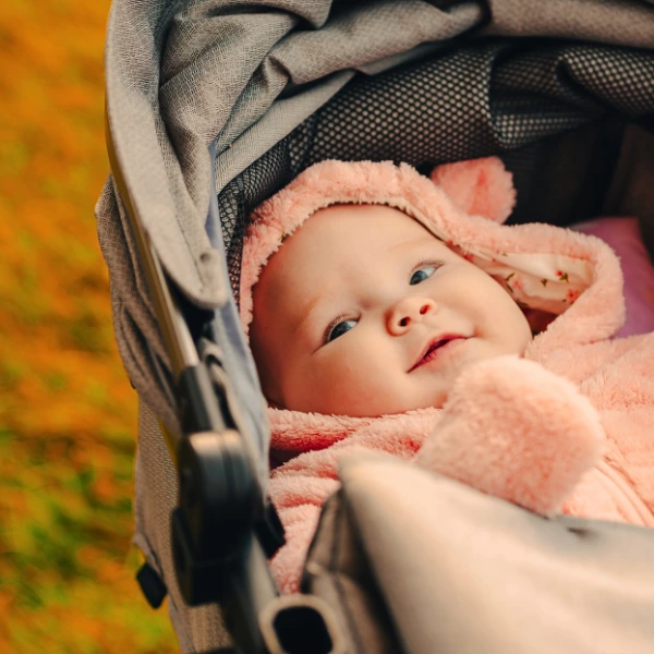 • En poussette avec une nacelle ou un cosy.